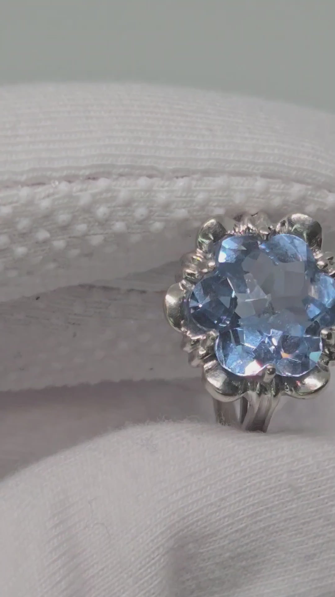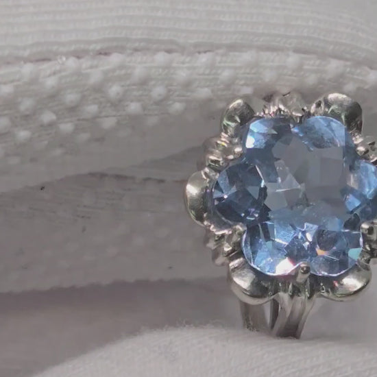 Vintage 1930s Sky Blue Topaz Cocktail Ring – 10K White Gold Basket Waves Design – Size 8