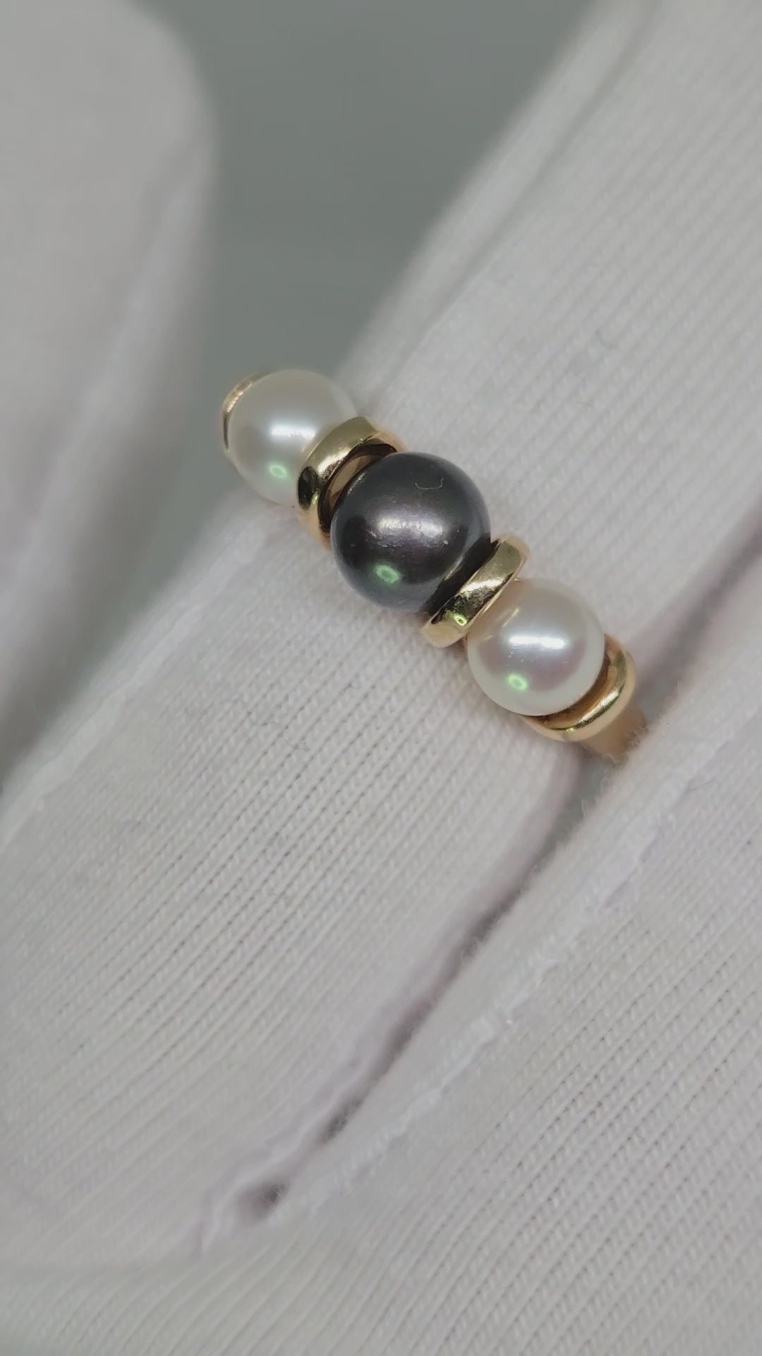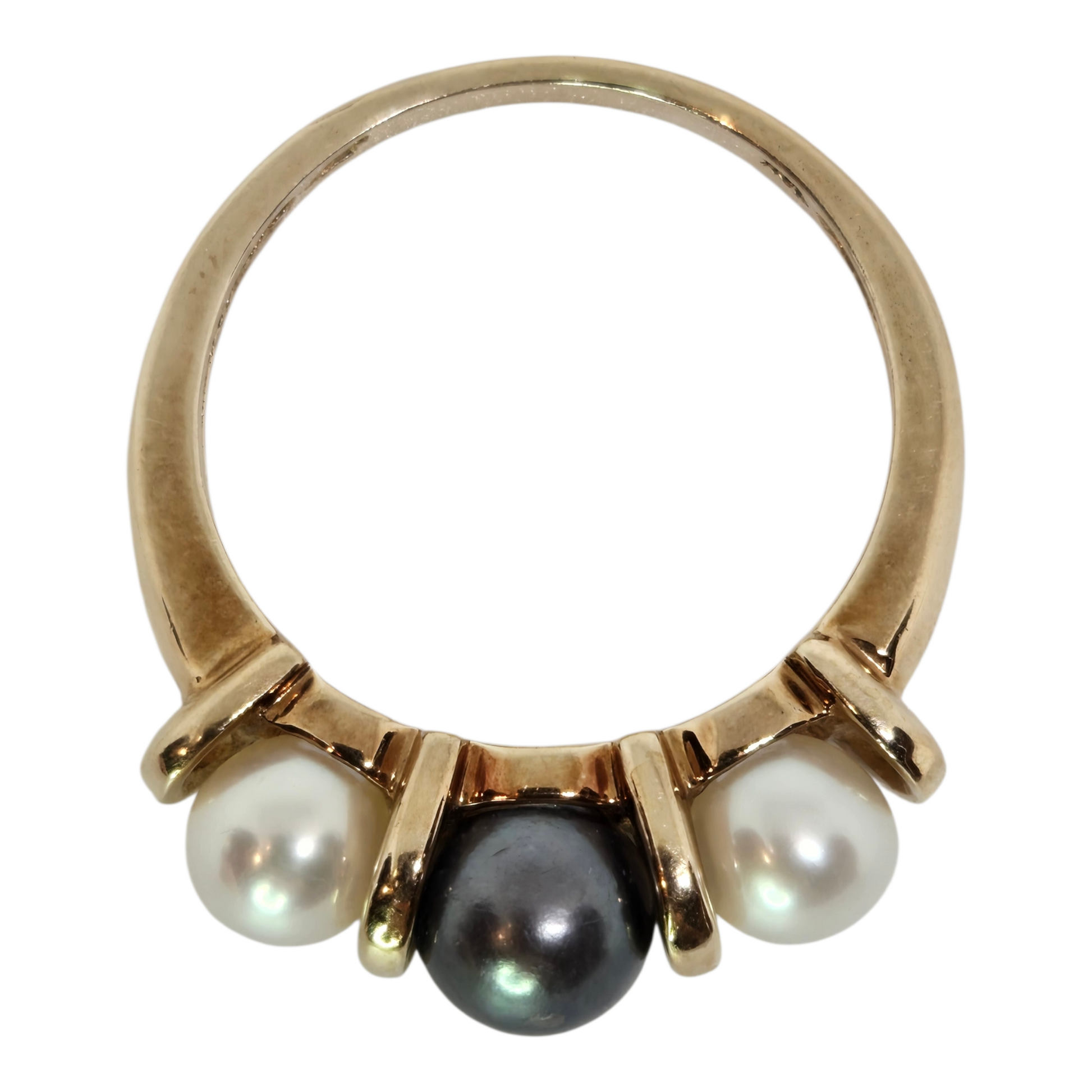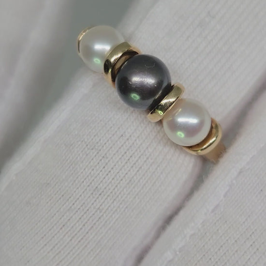 A timeless vintage treasure, this elegant 10K yellow gold trio pearl ring features three luminous pearls set in a classic design symbolizing the Past, Present, and Future. Delicate yet meaningful, this ring makes a beautiful statement piece or a heartfelt gift for someone special.